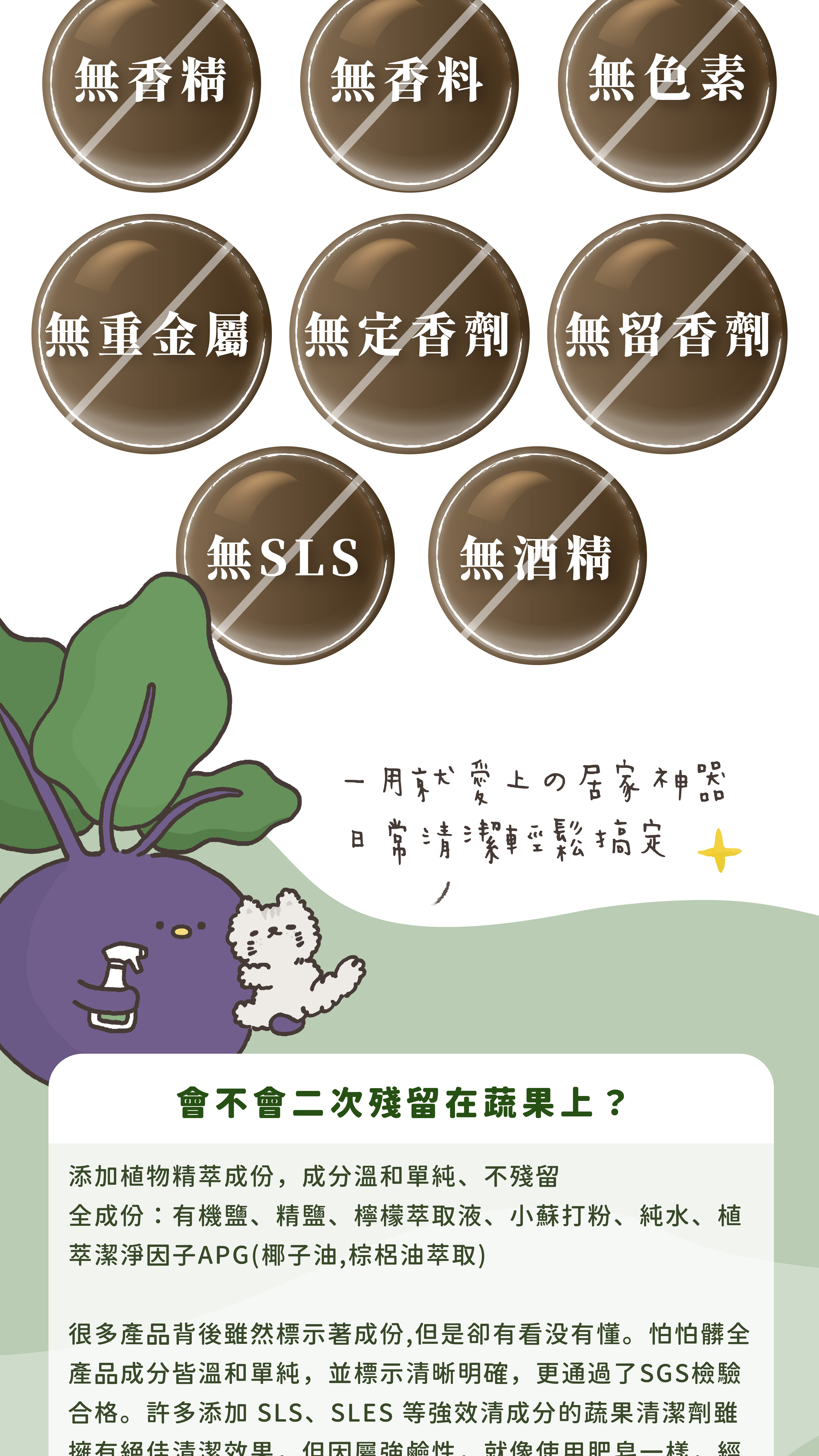 成分:純水、植萃潔淨因子APG(椰子油,棕梠油萃取)、有機鹽、精鹽、檸檬萃取液、食品級蘇打粉