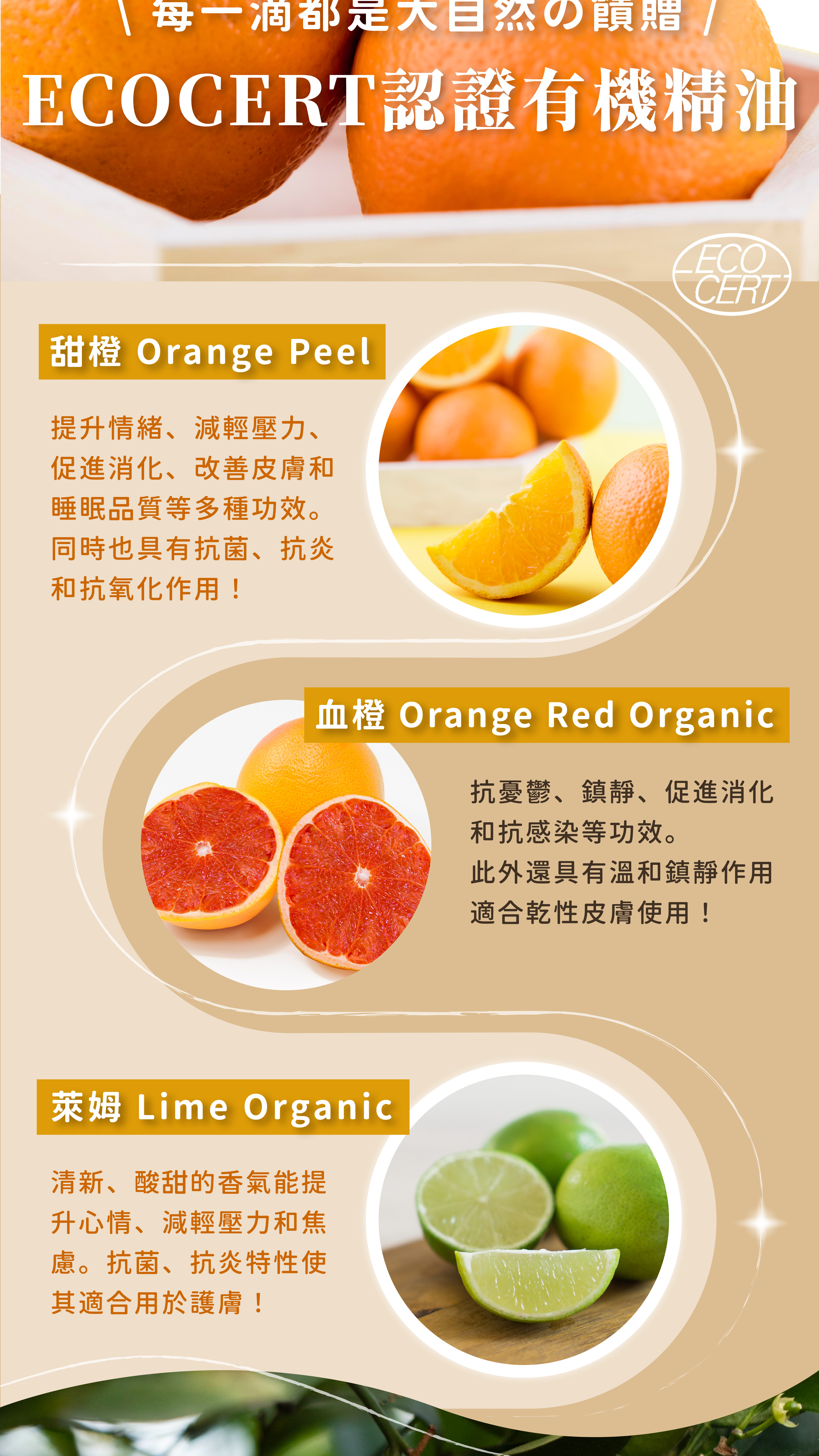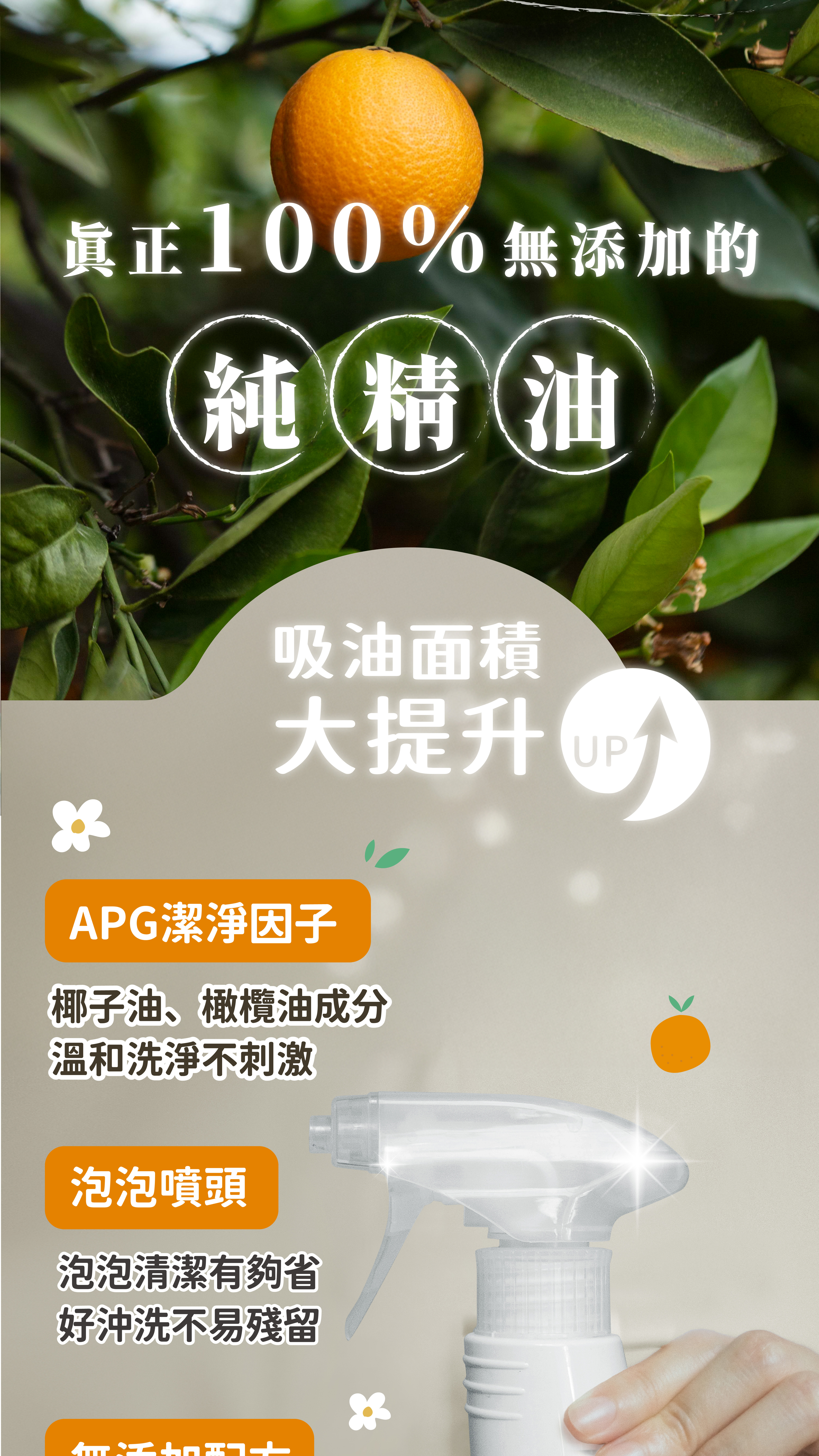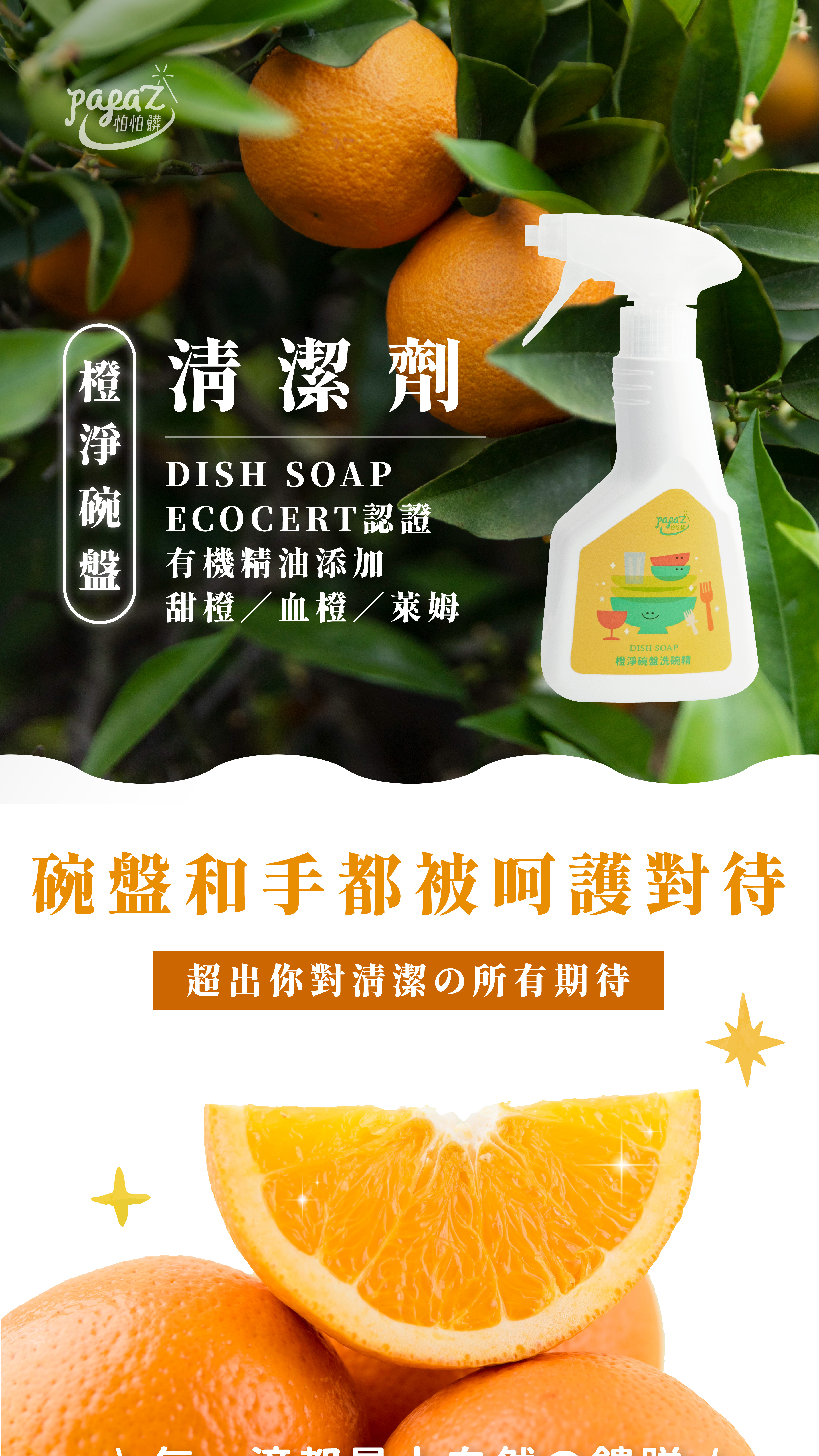成分:純水、ECOCERT認證有機甜橙精油、血橙精油、萊姆精油、植萃潔淨因子APG(椰子油,棕梠油萃取)、棕櫚油皂液、食品級蘇打粉